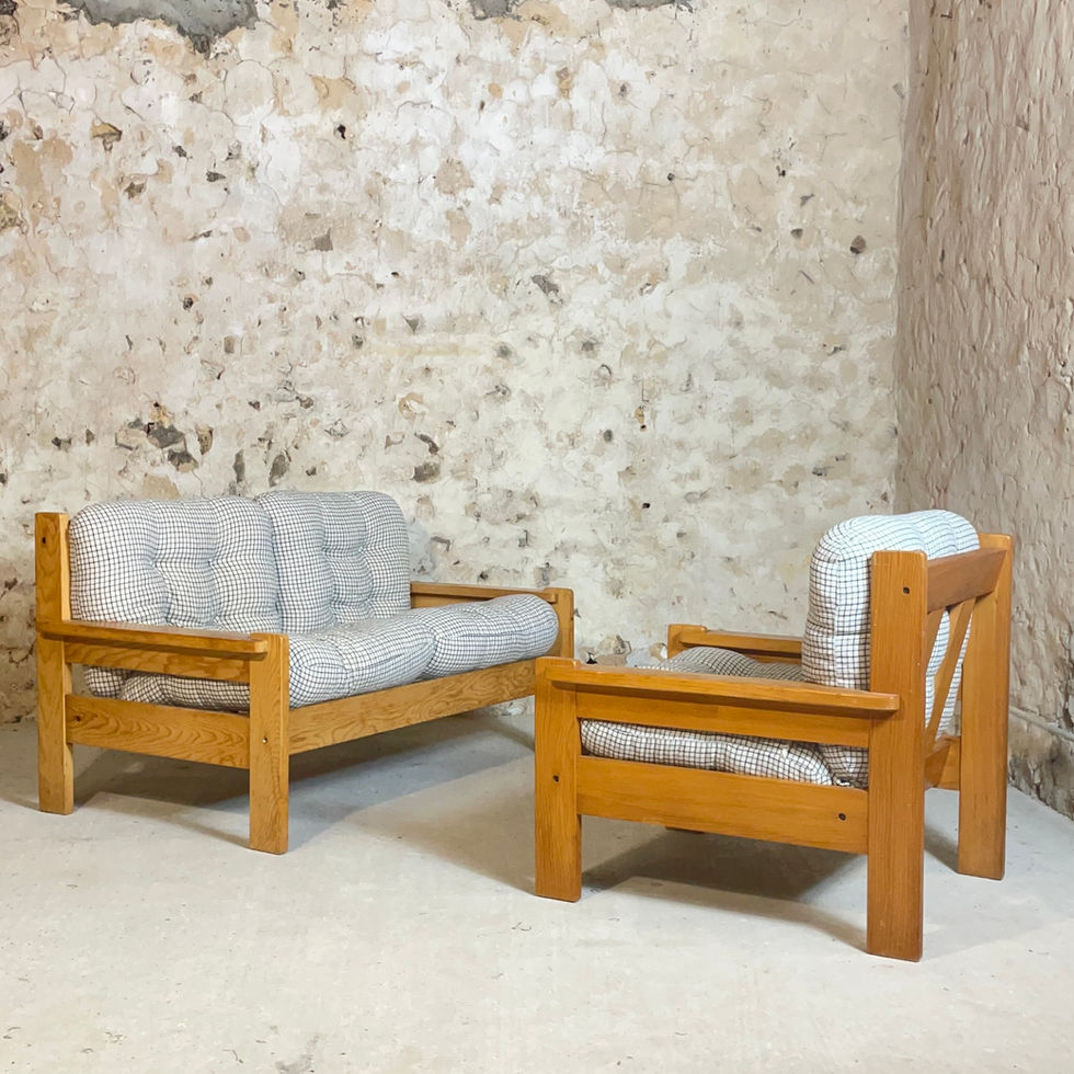Banquette deux places en pin année 70-80 provenance Allemagne. Très confortables et moelleux, les coussins d’origine ont été lavés et sont en très bon état. On adore le motif quadrillé du tissu! Bonne taille pour un petit salon ou pour coin cosy dans une chambre à couché ! Est également disponible en boutique, le fauteuil assorti !