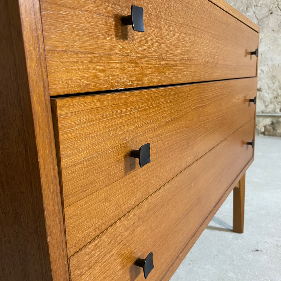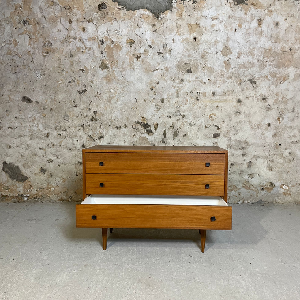 Cette commode vintage séduit par son design épuré et ses lignes typiques du style mid-century. Fabriquée en bois massif avec une belle finition chaleureuse, elle repose sur des pieds fuselés qui lui confèrent une silhouette élégante et légère. Ses trois tiroirs spacieux offrent un rangement pratique tout en conservant une esthétique sobre et intemporelle. Idéale pour une chambre, un salon ou une entrée, elle s’intègre parfaitement dans une décoration vintage, scandinave ou moderne. Excellent état.