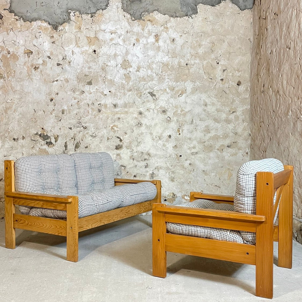 Fauteuil années 80 provenance Allemagne en pin. Très moelleux et confortable il saura se glisser dans n’importe quelle décoration. La banquette assortie deux places est également disponible sur la boutique en ligne !