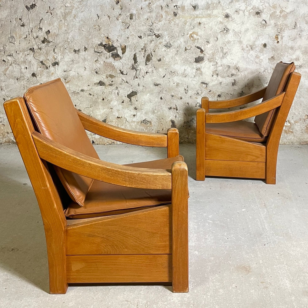 Paire de fauteuils brutalistes en bois massif, les coussins sont en cuir couleur cognac. Origine inconnue, deuxième moitié XXe siècle. Les assises sont amovibles et cachent une partie coffre. La pièce en bois constituant l’assise et ouvrant le coffre est récente, quelques défauts mineurs sur le cuir sont à signaler et un des dossiers n’a plus son revêtement cuir, voir photos. Sinon bon état de l’ensemble, très confortable et au design graphique.