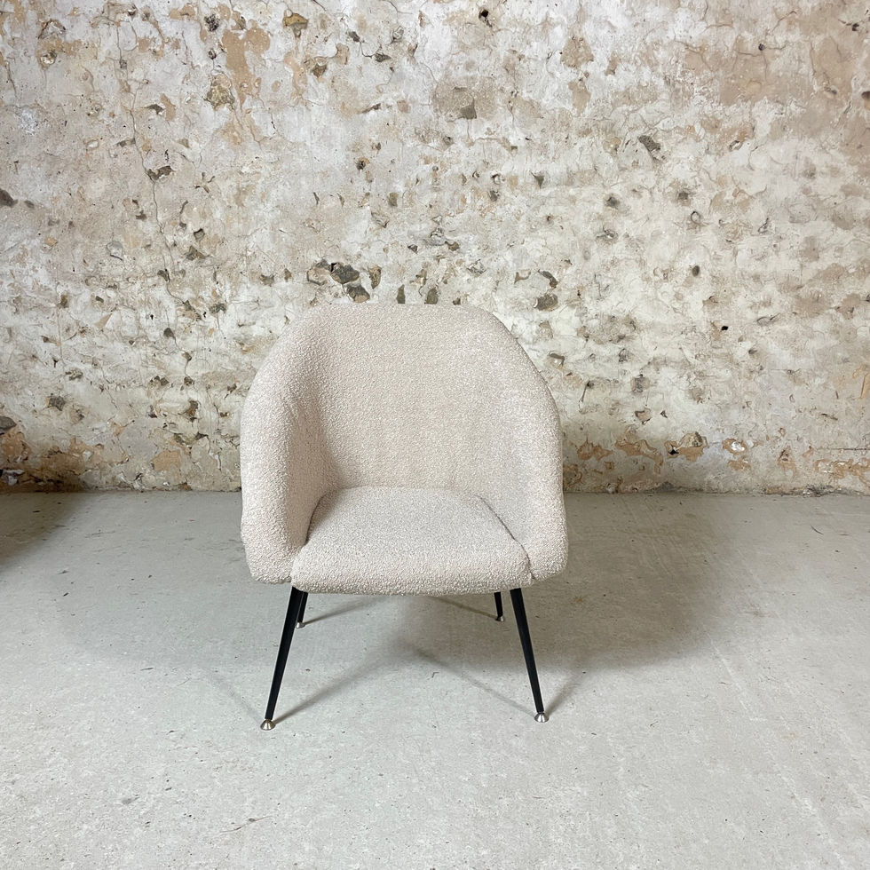 Paire de fauteuils EWA années 70, provenance Pologne. Ils ont été retapissés dans une bouclette beige. Très confortables, ils sont « enveloppants », parfaits pour de longues discussions d’hiver au coin du feu !