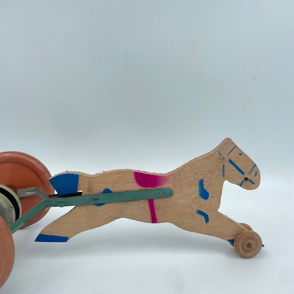 Jouet ancien première moitié XXe, cheval à roulettes en bois peint et métal. Très bon état d’usage. Dimensions :H 10 x L 26 x P 12 cm