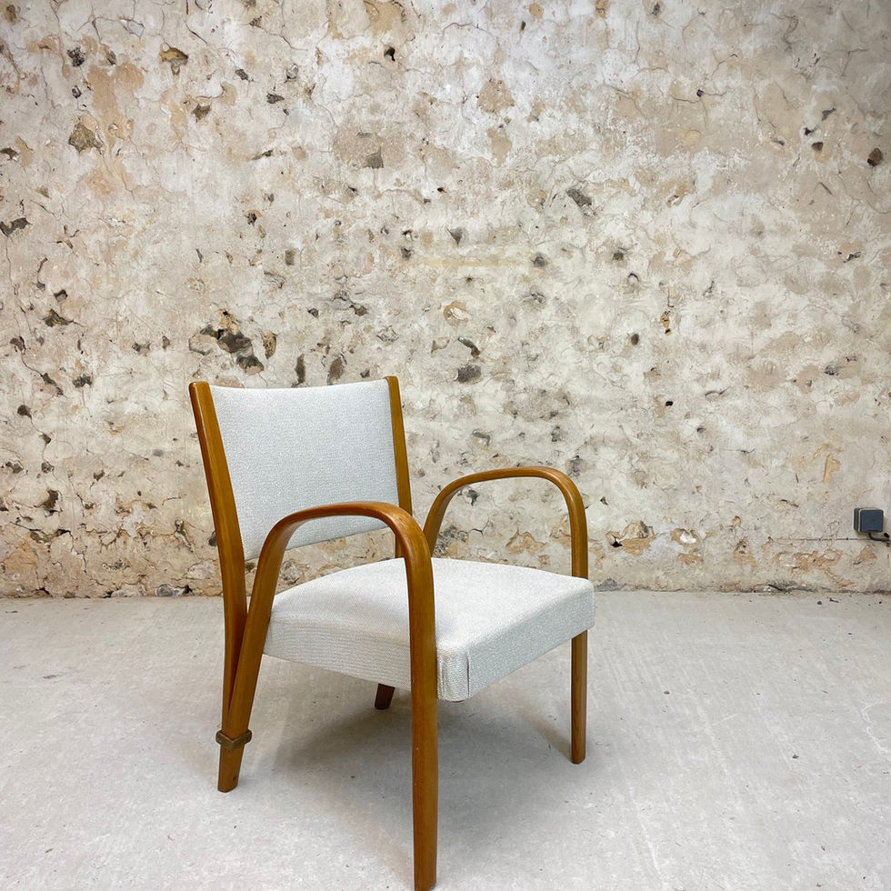 Paire de fauteuils modèles bow wood édités par Steiner et dessinés par Hugues Steiner (1926-1991) en frêne courbé et tissu vinyle blanc cassé. Défi esthétique et technique, le piètement est travaillé d'une seule pièce en bois massif cintré qui vient former l'accoudoir. Une bague en laiton, unique point d'attache, assemble piètement et dossier assurant souplesse et confort d'assise. Modèle élégant qui s'harmonise parfaitement avec un intérieur classique ou contemporain. En très bon état d’usage, quelques traces d’usures conforme à leur âge, voir photos.
