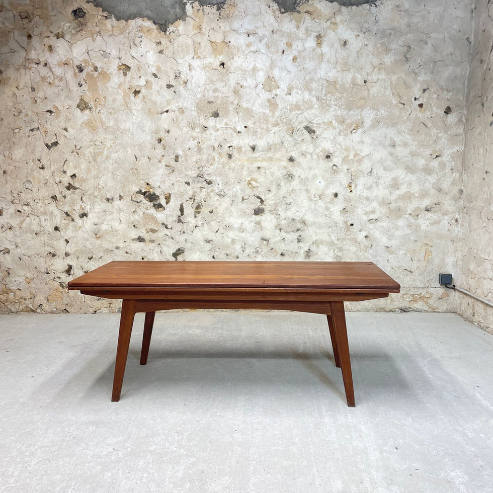 Table modulable scandinave années 60 en teck. D’une table basse elle peut se monter en table et asseoir jusqu’à 6 personnes grâce à ses deux rallonges intégrées. Parfaite pour les petits espaces ! Très bon état, traces d’usures conformes à l’âge et l’usage.