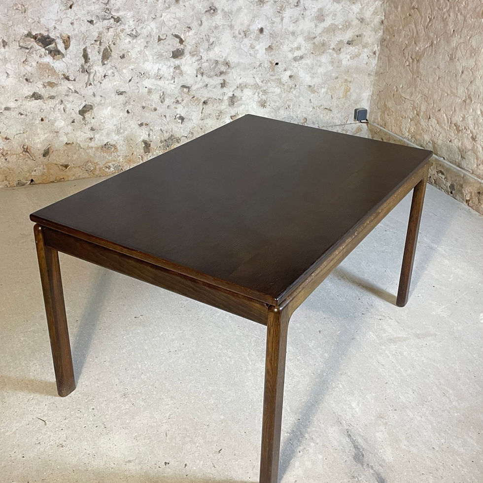 Table à manger en chêne et teck foncé années 60, provenance Allemagne. Elle peut asseoir de 6 à 8 personnes grâce à ses rallonges papillons positionnées en bout de table. On notera le détail arrondi des pieds et le plateau en suspension qui la rendent particulièrement élégante. Très bel état vintage, quelques légères marques d’usures sur le plateau à signaler voir photos.